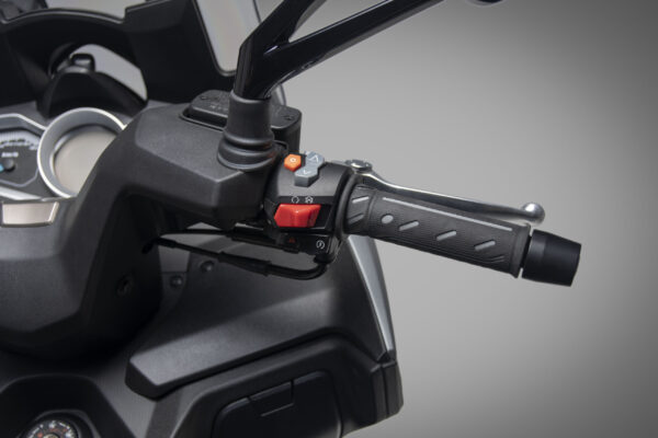 L’altezza del parabrezza è regolabile su 5 livelli, manualmente e senza uso di attrezzi. Così,Kymco XCITING 400 TCS scooter termico si adatta facilmente alla statura di ciascun pilota e alle più diverse condizioni di guida. Il nuovo manubrio, a forma di “V”, migliora la precisione di guida e ottimizza la visibilità del cruscotto. L’ergonomia è stata progettata per offrire la massima comodità al pilota e al passeggero.